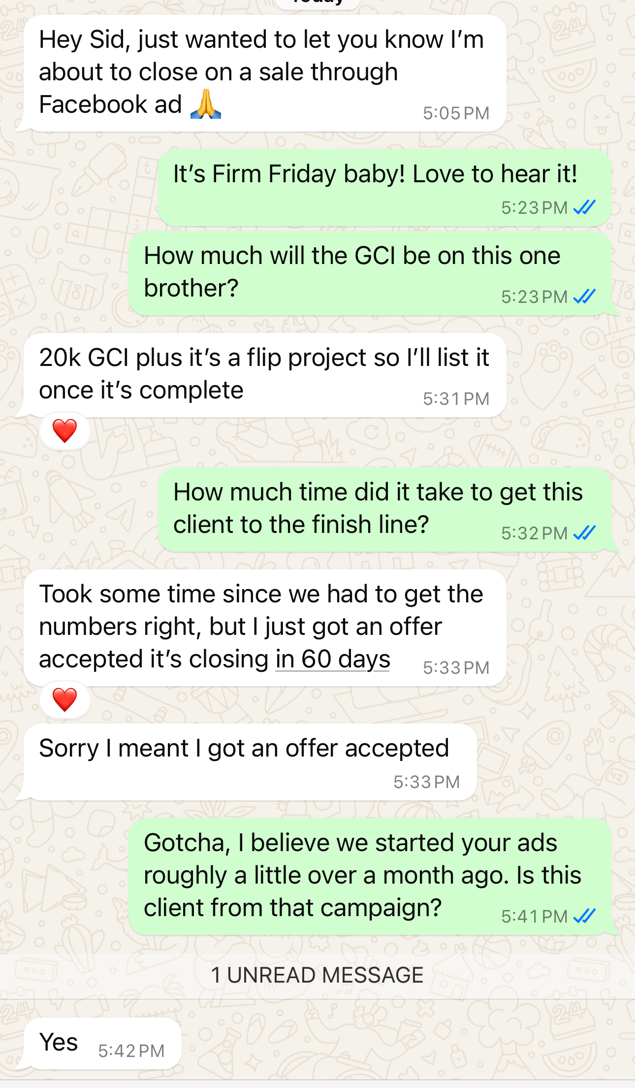 “Initially skeptical about social media’s impact on real estate lead generation, I found myself overwhelmed by the numerous options and conflicting advice. After numerous trainings and failed attempts at running my own ads, I was ready to give up. But meeting Sid changed everything. In just 60 days, with only a few hours of effort each week, I’ve seen my business transform from stagnant to thriving. Sid’s targeted lead generation strategy not only renewed my trust in digital marketing but also equipped me with the tools and confidence I needed to succeed. Now, I have a reliable system that consistently delivers, with 103 qualified leads, 6 booked appointments, and over $35,000 in potential earnings. The results speak for themselves—I couldn’t be happier!”